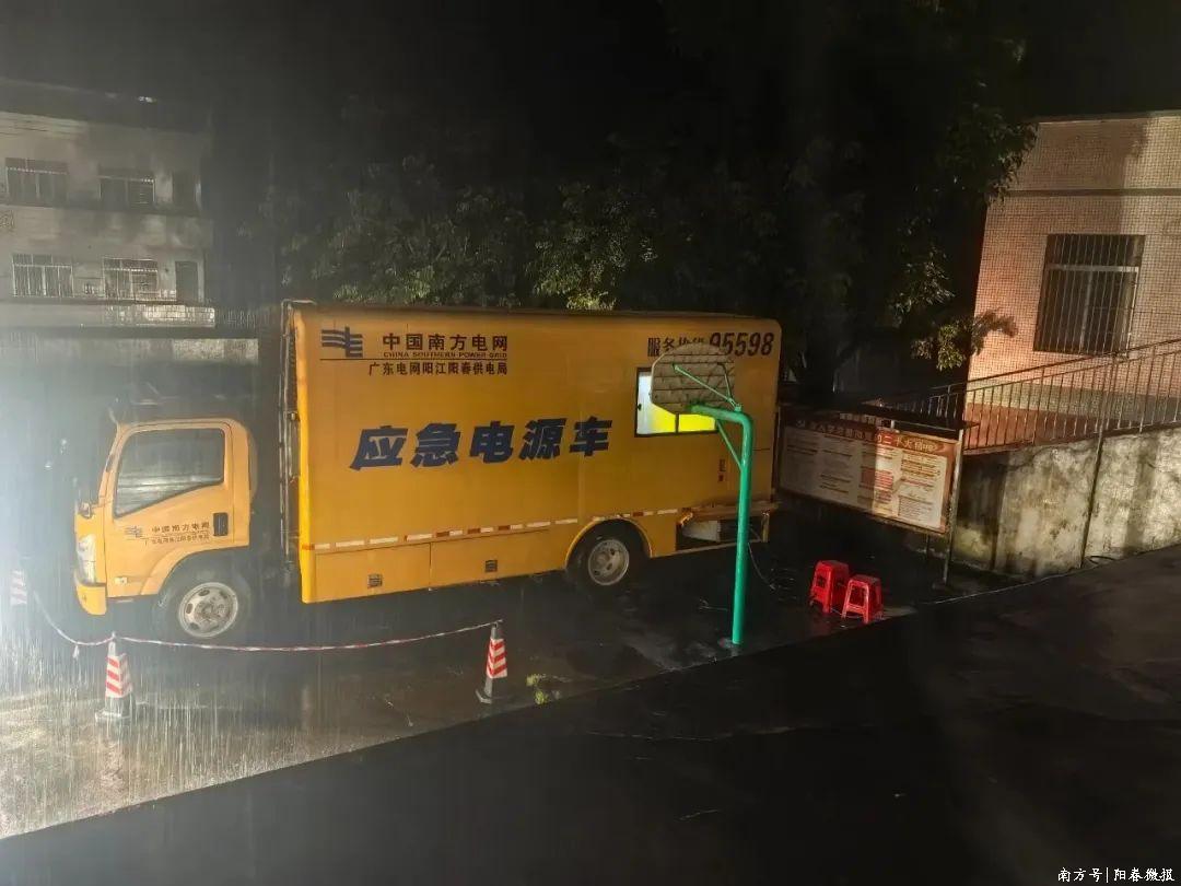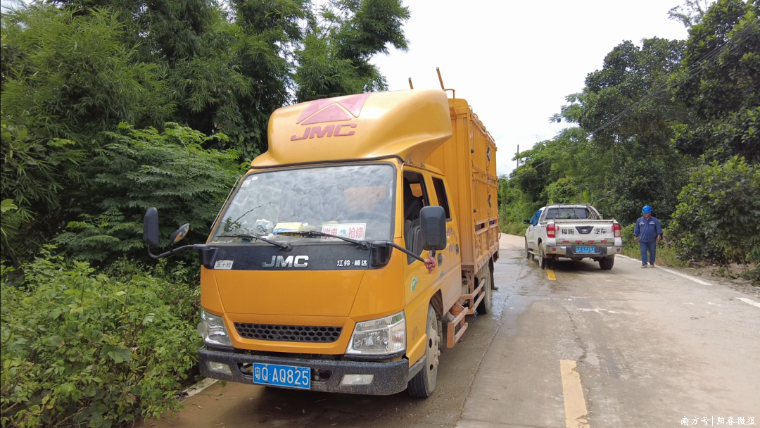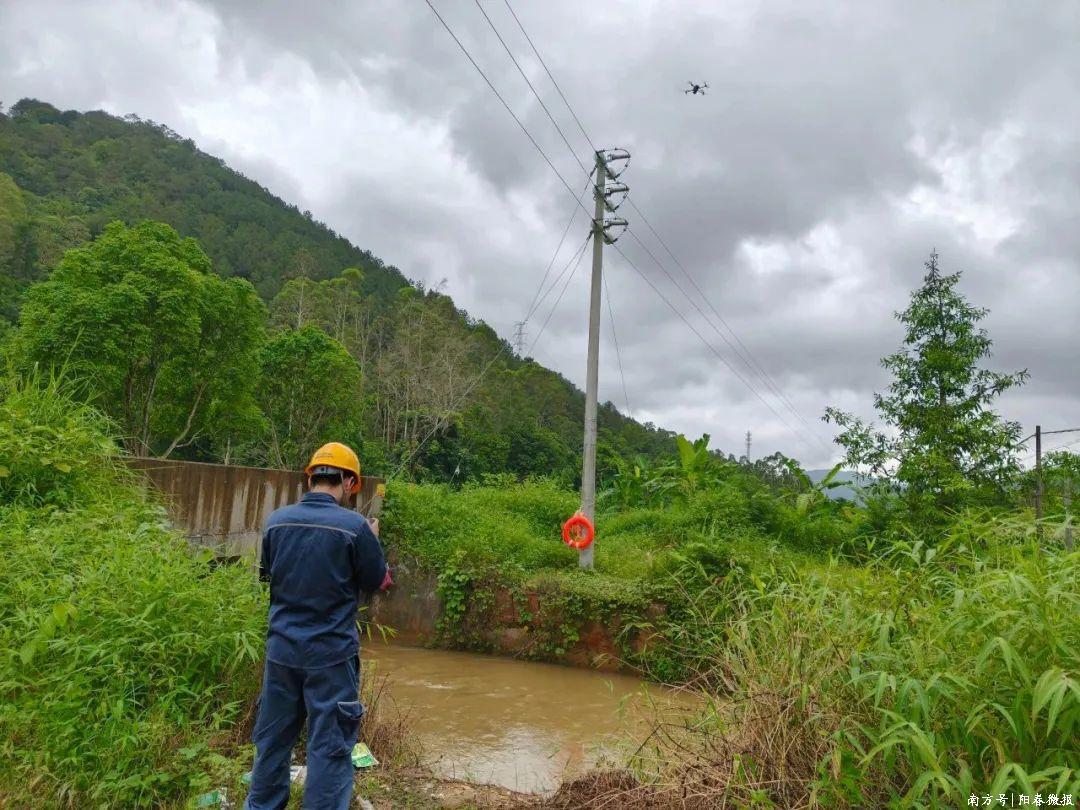 八甲镇作为重灾区,山体滑坡阻断道路,通讯中断失联风险剧增。阳春供电局党委立即组建党员突击队、青年突击队,在洪水中搭建起“抢修通道”。18日凌晨,应急发电车冒雨驶往长塘小学临时安置点,为转移群众架起24小时光明屏障。党员干部带头,在泥泞中开辟临时作业点,采用无人机巡查与人工徒步相结合的方式,争分夺秒锁定故障点,克服天气影响开展抢修作业。